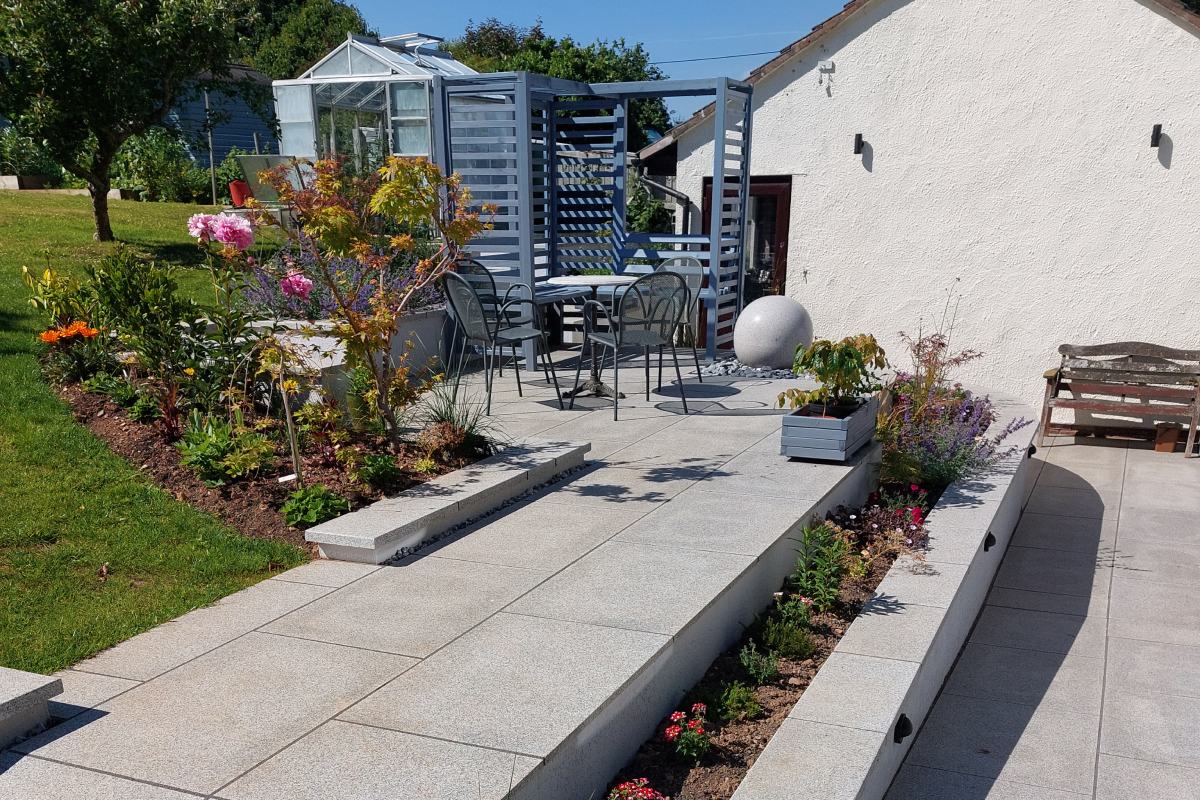 A key component of the design is the large granite terrace, which anchors the garden and provides a generous area for entertaining and dining. The clean edges of the granite, combined with its subtle variation in tone, perfectly complement the modern architectural lines of the house.